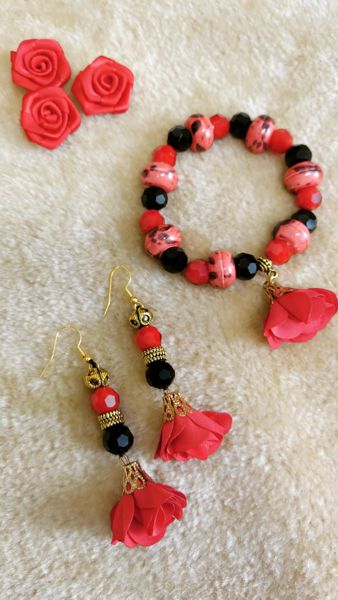 Conjunto Pulseira e Brincos de Pomba Gira Rosa Vermelha Mod.1
