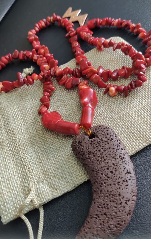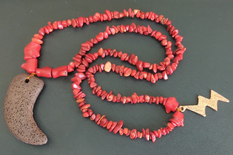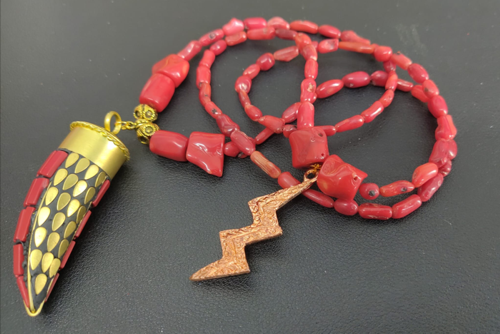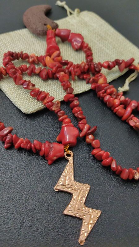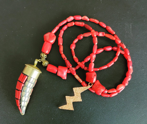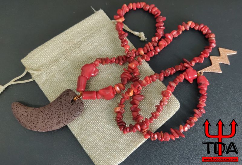 Guia especial de Iansã em cascalho de coral c/ ponto de aço em formato de raio na cor bronze e pendente em formato de chifre em cerâmica.