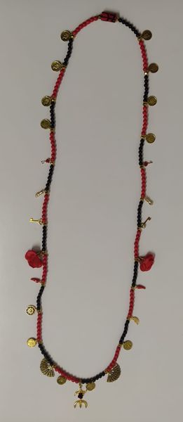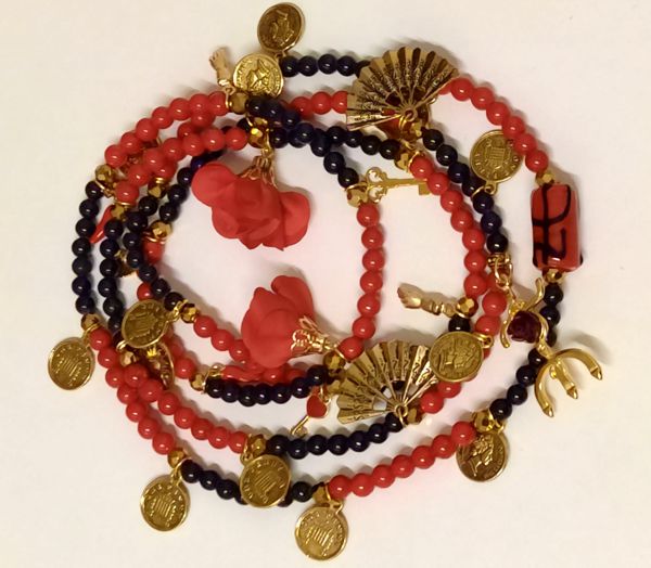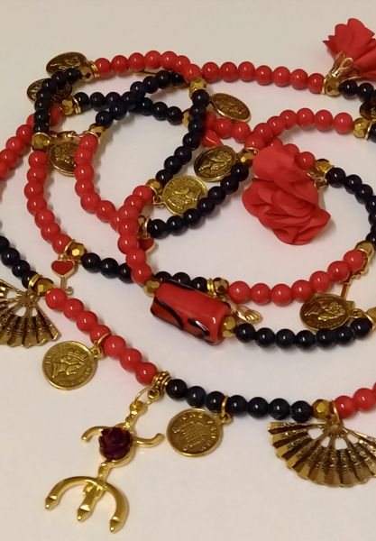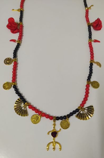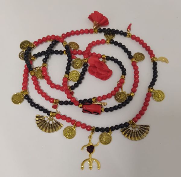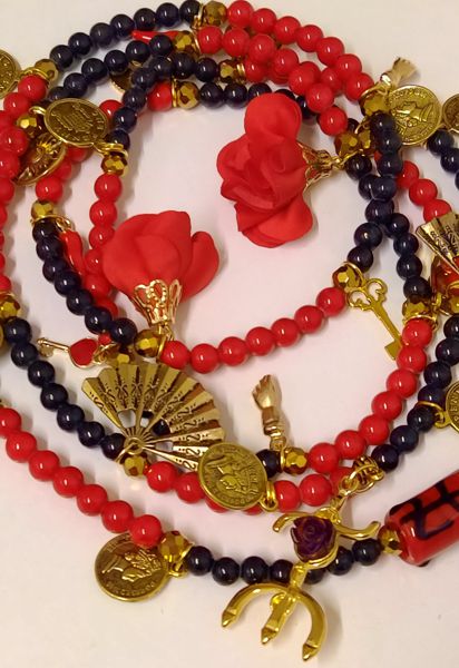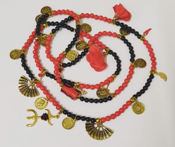 Guia especial de luxo de Pomba Gira Cigana, feita em vidro a imitar pedra nas cores vermelhos e pretos, bem como separadores em metal dourado, pingente de rosas em tecido, pingentes em metal dourado e tridente com uma rosa.